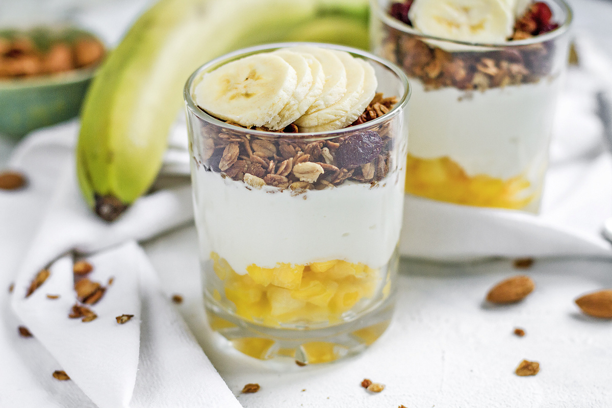 Шаг 2: Гранолу лучше всего подавать в стаканах. На дно каждой порции выложите кусочки ананаса, затем добавьте слой йогурта, и, наконец, сверху вся конструкция будет украшена гранолой. В завершение процесса следует добавить кружочки банана для яркости и свежести.
