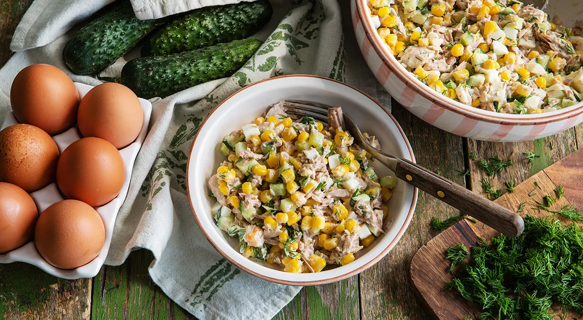 2. Салат с тунцом и кукурузой: Смешайте консервированный тунец, кукурузу, огурцы и немного майонеза или йогурта, и сытный перекус будет готов за считанные минуты.