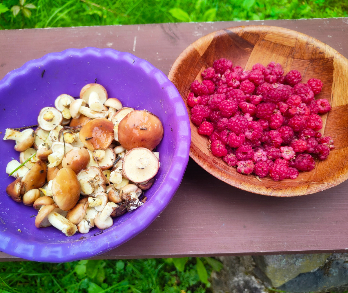 Утро начинает радовать запахом свежих грибов: после недавних дождей на участке появились молодые маслята. Их аккуратно чистят, варят и маринуют. Также на утренней прогулке собираются ягоды — малина оказывается в баночках для морозильника, как только птицы успели позавтракать.