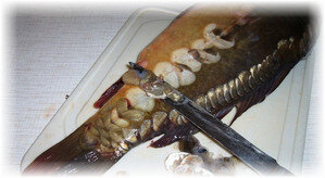 Дальше нужно удалить темную пленку внутри брюшной полости и отрезать голову. После этого карпа следует промыть под проточной водой. Если требуется филе, делайте надрезы параллельно позвоночнику, избегая повреждений ребер. После этого аккуратно снимите мясо с ребер и отделите филе от хвоста.