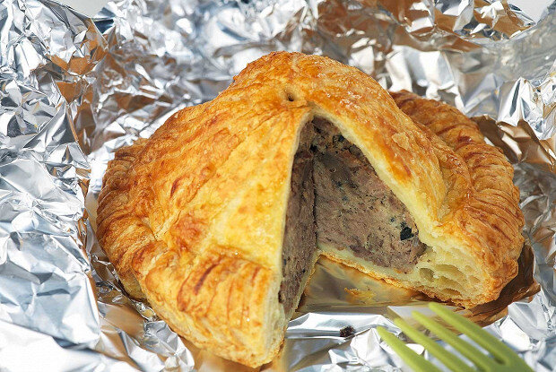 Тесто разделить на две части, раскатать и убрать в холодильник на 15 минут.Мясо, овощи и чеснок нарезать мелко и обжарить на сливочном масле до золотистой корочки. Затем добавить красное вино и тушить ещё 2 минуты.Налить воду, чтобы покрыть мясо, и готовить на медленном огне от 45 минут (в скороварке) до 1,5 часов (в сотейнике).По завершении приготовления вынуть мясо, разобрать его на волокна, добавить немного бульона и остудить в холодильнике.Смешать остывшие мясо и овощи с одним яйцом, приправить по вкусу и тщательно перемешать.Сформировать из массы шарик, поместить его на раскатанный круг теста, окрасить края яйцом и накрыть вторым кругом. Запечатать края и сделать небольшое отверстие сверху.Выпекать в разогретой до 180 градусов духовке в течение 20-25 минут до золотистого цвета.Приготовить соус, смешав майонез, васаби, йогурт и лимонный сок, и подавать пирожок с ним в холодном виде.Этот изысканный пирожок станет идеальным выбором для любого застолья. Приятного аппетита!
