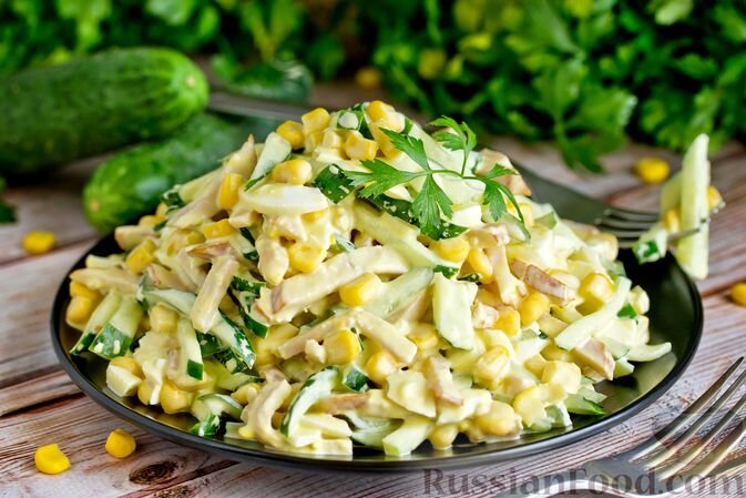 Не менее популярный салат с курицей, огурцами, капустой и кукурузой — это идеальное блюдо для тех, кто хочет насытиться. Сытное куриное мясо в сочетании с яичными блинчиками и свежими овощами создаёт отличный баланс вкуса и текстуры.