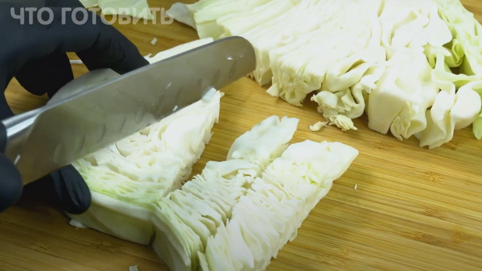 Начинается все с нарезки капусты, картофеля и лука. Важно, чтобы картофель и капуста были нарезаны примерно одинаковыми кусками. Это позволит им приготовиться равномерно: если картофель будет крупнее, капуста приготовится гораздо быстрее, что нежелательно. После нарезки капусту следует посолить и тщательно перемешать.
