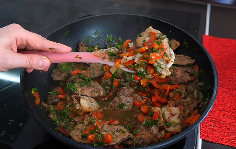 Проверьте, чтобы блюдо томилось на слабом огне 5–7 минут: лук пустит сок, а печень останется сочной. Перемешивайте содержимое аккуратно только в конце, когда овощи прогреты.
