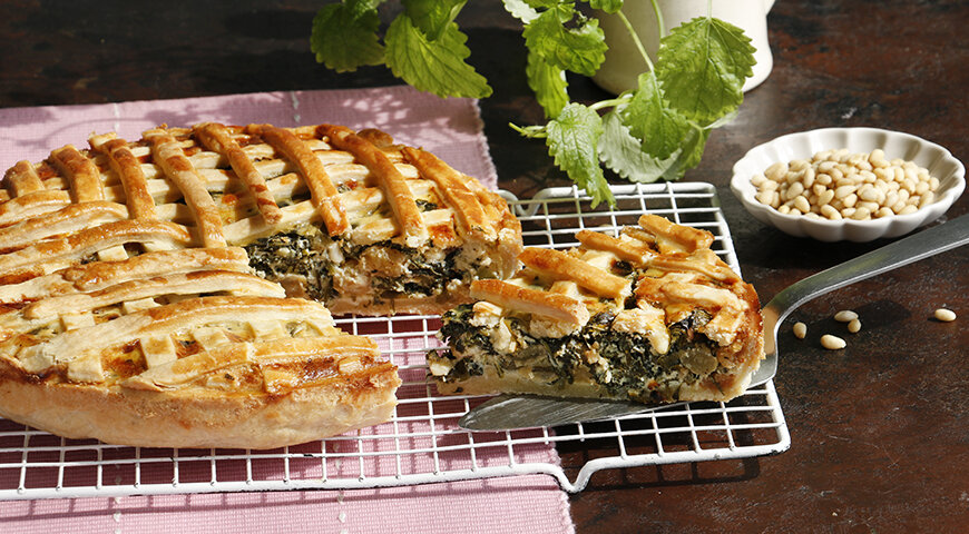 Пирог, обладающий ярким вкусом, получится, если объединить шпинат с изюмом и кедровыми орехами. Для разнообразия в начинку можно добавить листья мангольда, свекольную ботву или свежий салат ромен. Идеально подавать этот сюрприз для гурманов через час после выпечки, когда он еще не горячий, но и не холодный.