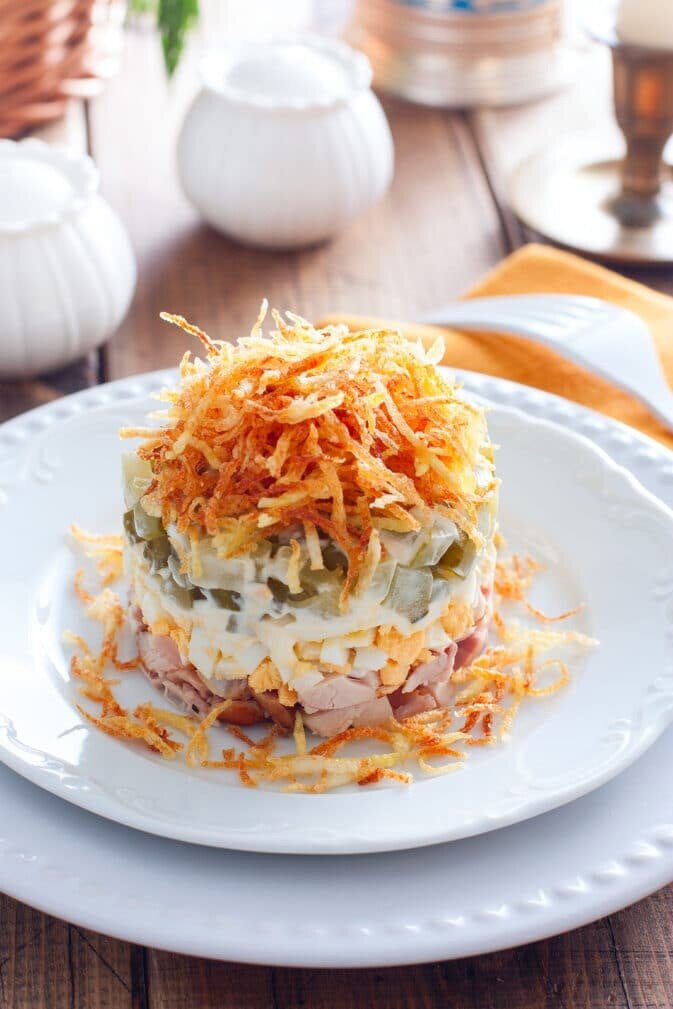 Этот восхитительный салат с копчёной курицей идеально подходит как для праздничного стола, так и для обычного семейного ужина. Его неповторимый вкус и слоёная структура сделают любое событие особенным.