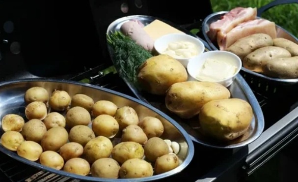 - Копчёный картофель отлично сочетается с мясом и луком, которые можно готовить на мангале.