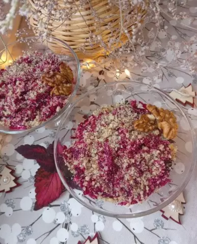 Свеклу натирают на терке, половину распределяют по креманкам, добавляют слой майонеза, затем выкладывают натертую смесь желтка и белка. Снова нанести майонез. Чернослив требуется хорошо промыть, если он жестковат, можно замочить в горячей воде. После просушки нарезать мелко и выложить на предыдущий слой, добавляя еще немного майонеза. Завершающим слоем станет оставшаяся свекла, посыпанная орехами. По желанию, можно украсить салат веточкой зелени или орехами для дополнительного эффекта.