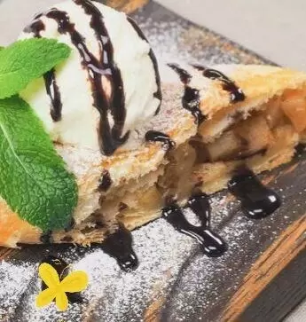После выпечки дайте штруделю немного остыть, затем посыпьте сахарной пудрой или корицей. Для разнообразия можно полить шоколадом. Подавайте с мороженым и чашечкой свежезаваренного кофе — идеальное завершение вечера!