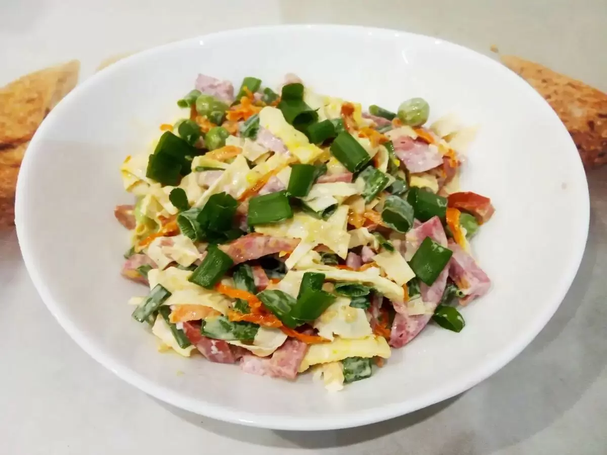 Теперь пришло время объединить все ингредиенты в одной большой миске: добавить яичные полоски, обжаренную морковь, горошек, колбасу, лук и чеснок. Заправить смесь майонезом по вкусу и при необходимости добавить соль и перец.