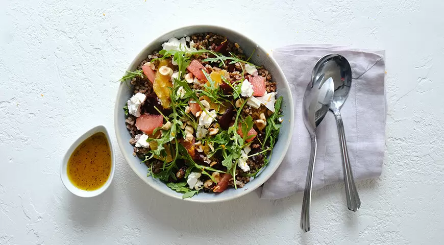 - Салат с гречкой, свеклой, фетой и руколой: свекла, апельсин, грейпфрут и орехи прекрасно сочетаются с гречкой и создают удивительный вкус. Заправьте все оливковым маслом, лимонным соком и медом для пикантности.