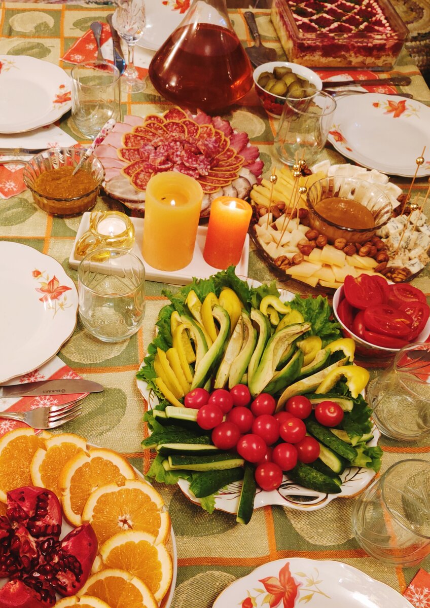- Закуски: салат «Селёдка под шубой», мясная и сырная тарелки, овощное ассорти, свежие фрукты и домашние соленья.