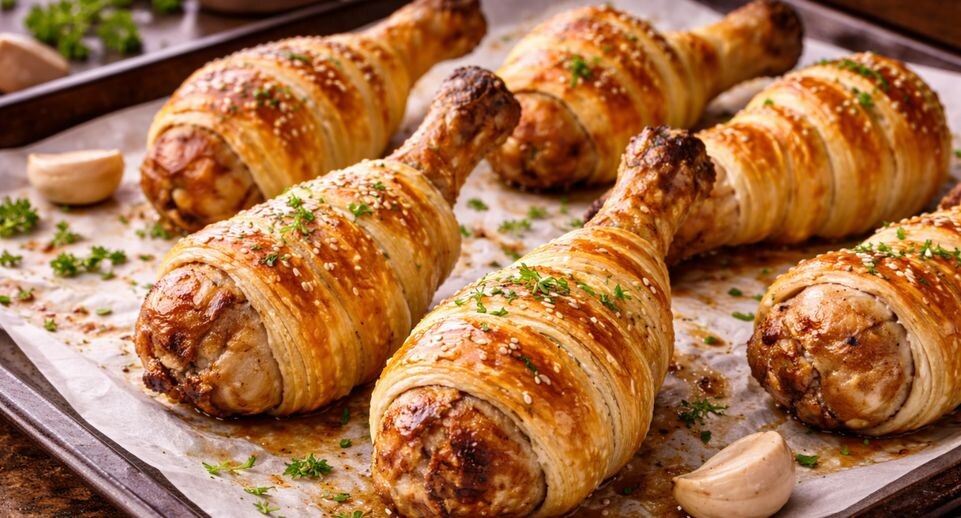Когда вечерний ужин требует особого подхода, но времени на сложные приготовления нет, этот рецепт куриных ножек в слоеном тесте — идеальное решение. Блюдо смотрится как произведение кулинарного искусства, хотя готовить его легко и быстро, используя готовое тесто всего за полчаса.