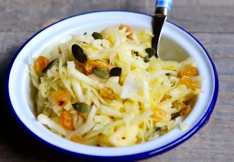 Приготовление: Нашинкуйте капусту, подождите, пока выделится сок, и добавьте заправку. Оставьте на 15 минут перед подачей.