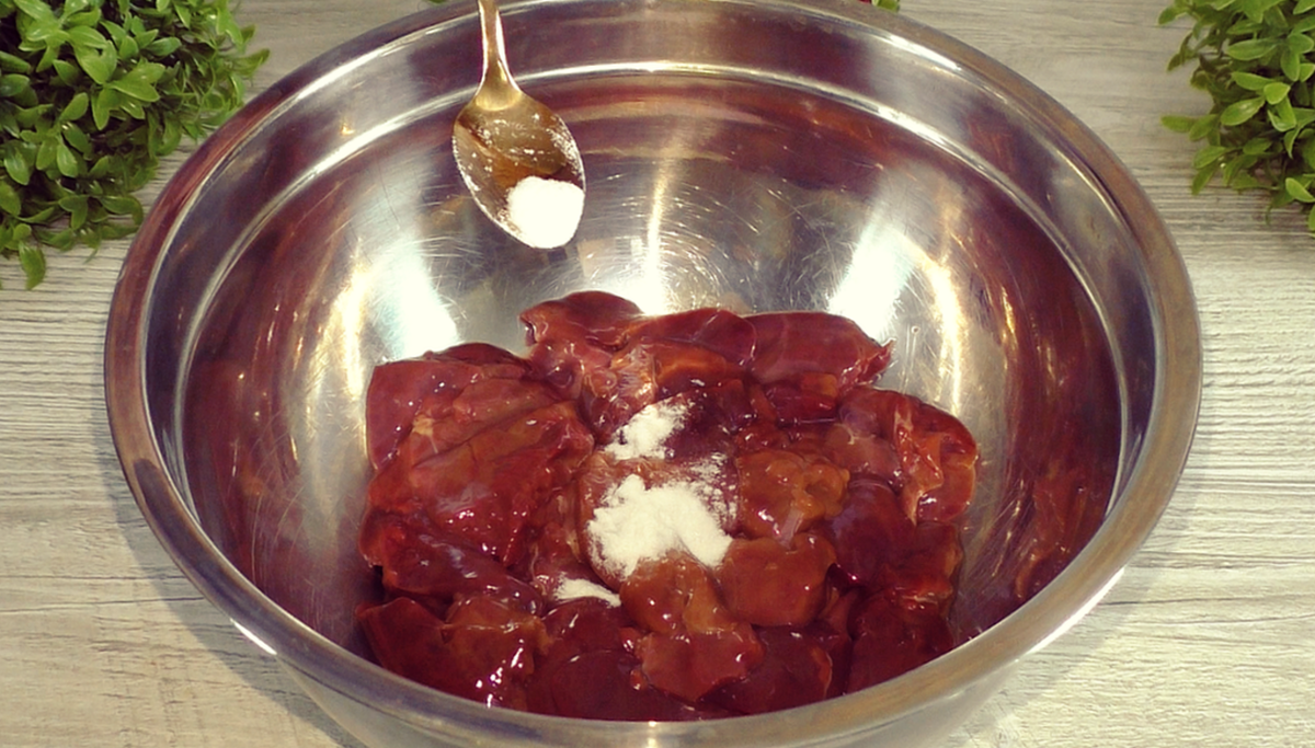 После этого к 500 г печенки добавляют 0.5 ч. л. соды. Соду нужно хорошо перемешать с печёнкой, чтобы она равномерно распределилась. Дайте смеси постоять около 15-30 минут — это сделает вкус ещё более нежным.