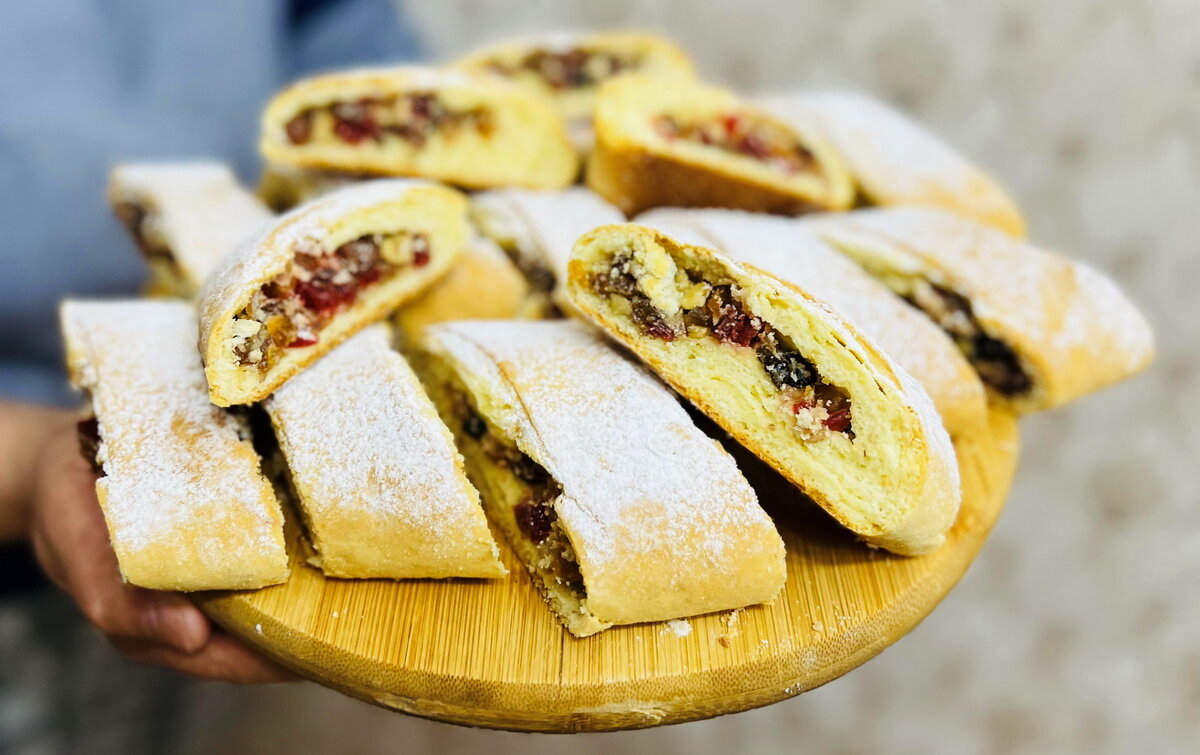 По истечении времени, разделите тесто на несколько частей и раскатайте в форме прямоугольников. На один край каждого пласта выложите начинку, аккуратно сверните в рулет и переложите на противень. Выпекайте в заранее разогретой до 180 градусов духовке около 20 минут. После выпечки дайте остыть, посыпьте сахарной пудрой и нарежьте на порции.