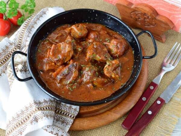 Подлива из свинины в томатном соусе готова к подаче!