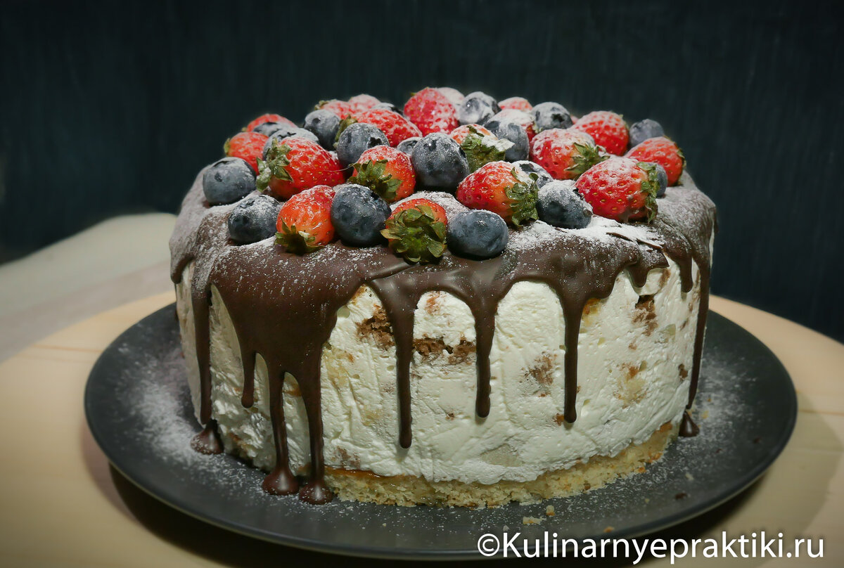 На второй день остается только украсить торт глазурью, которую лучше готовить, когда торт уже освобожден от формы. Глазурь выкладывают на середину, а затем по краям, прижимая ягоды, чтобы они не скатывались. Завершить оформление поможет легкая посыпка сахарной пудрой.