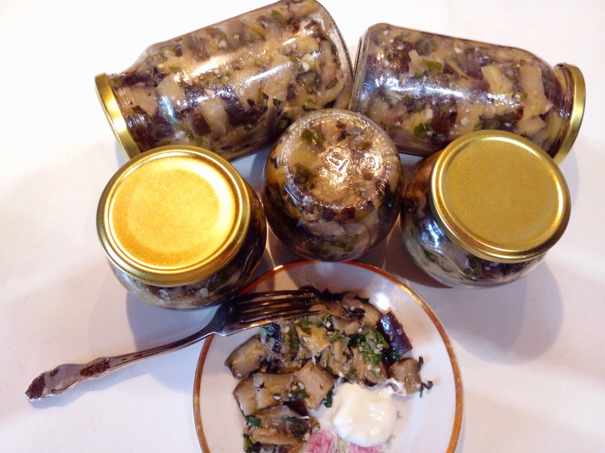 Когда баклажаны остынут, их нарезают на кубики и обжаривают в раскаленном оливковом масле на среднем огне по 5-8 минут. По необходимости добавляется соль для подкусывания. Готовые баклажаны смешиваются с зеленью и чесноком и перекладываются в горячие стерилизованные баночки.