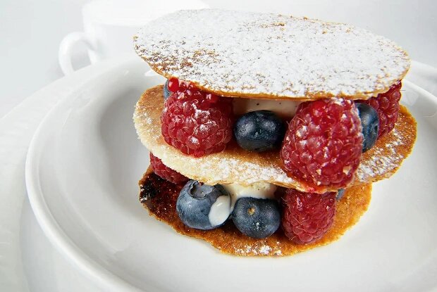 Теперь можно собрать мильфей: между лепестками теста укладывайте порции мороженого и ягоды. Каждый слой — это каркас вашего десерта, а верхний лепесток можно посыпать сахарной пудрой для отделки. Подайте на стол, и ваше произведение кулинарного искусства будет готово к дегустации!
