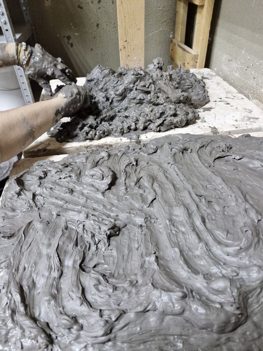 Подготовка глины не так сложна, как кажется. Нужно лишь вычерпать нужное количество шликера из бочки, оставить его на гипсовых плитах на час и затем тщательно вымешать, чтобы добиться нужной консистенции. Долгое время вымешивания позволит избежать лишних походов в спортзал.