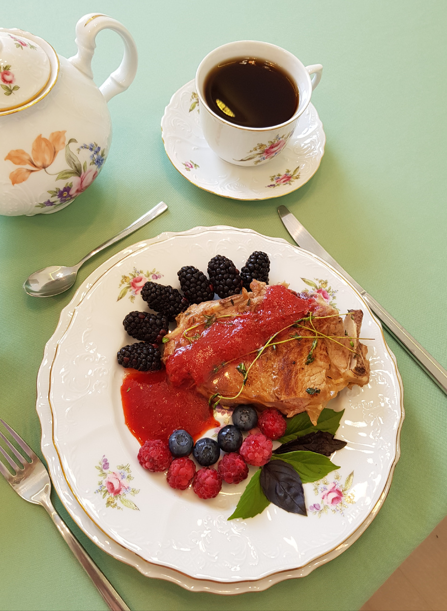 Готовый стейк выложите на тарелки и полейте клубничным соусом. Не забудьте украсить блюдо листьями базилика, свежими ягодами (ежевикой, малиной и голубикой) для яркого и свежего завершения!