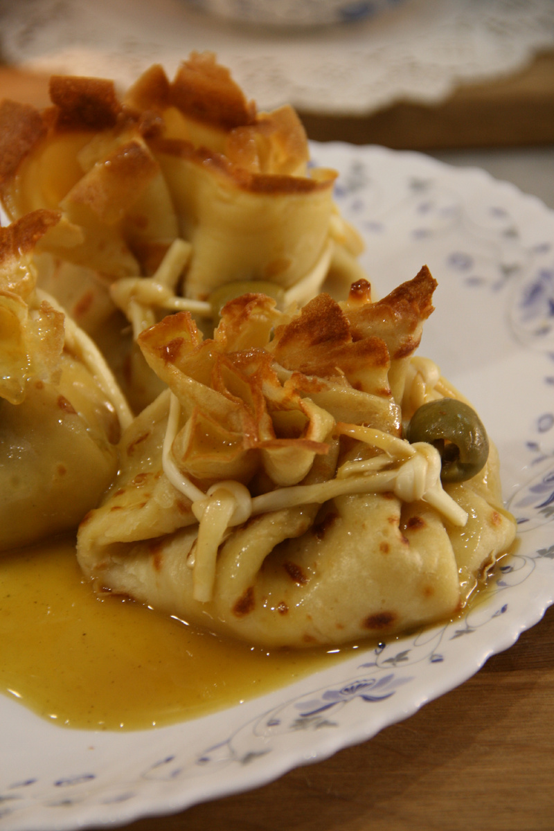 Теперь самый трепетный момент — сборка мешочков. В центр каждого блина кладем 1-2 ложки ветчинно-сырной начинки, поднимаем края и собираем в узелок, как в старинный кошелек. Перевязываем сырной нитью — Чечил, и добавляем оливку для завершения. Каждый мешочек становится маленьким шедевром, наполненным заботой.