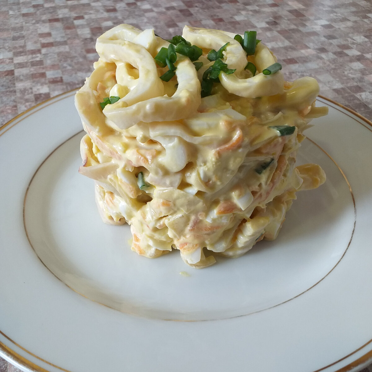 3. Сборка салата. Отварите яйца, нарежьте их кубиками, добавьте в салатник с кальмарами. Затем включите обжаренные овощи и нарезанный зеленый лук. Пора добавить соль, перец и заправить майонезом. Хорошо перемешайте ингредиенты, и салат готов к подаче!