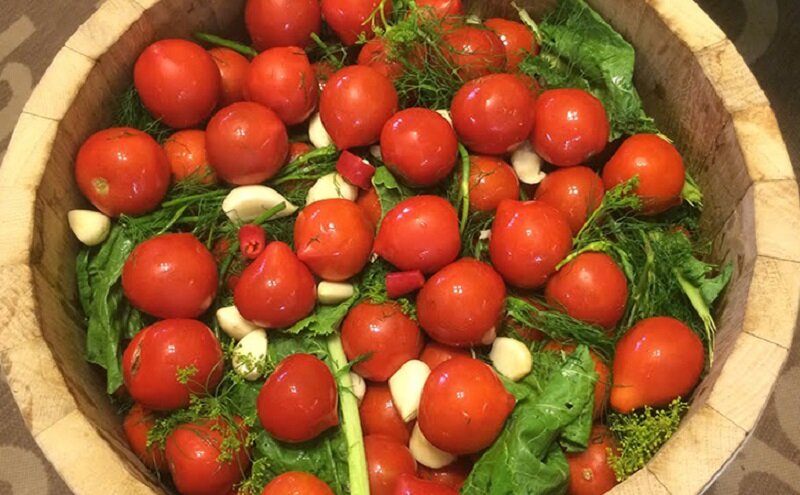 Для начала важно выбрать спелые помидоры небольшого размера. Их количество будет зависеть от планируемых заготовок. Все емкости, в которых будет проходить ферментация, необходимо тщательно вымыть с содой и обдать кипятком.