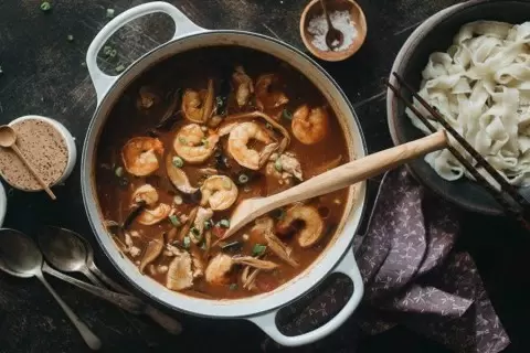 На сковороде разогреть растительное масло, обжарить грибы, добавить имбирь и нарезанный зеленый лук. После этого добавить томаты и куриный бульон, довести до кипения, добавив соевый и устричный соусы. Когда соус наберет аромат, следует добавить креветки и свинину, доваривайте еще пару минут.