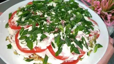 Представляем удивительное кулинарное открытие — закусочный торт из молодых кабачков и томатов. Это блюдо обещает стать звездой на любом столе, радуя как глаз, так и желудок.