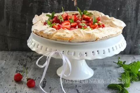 На застеленном пергаментом противне выкладывают белковую массу, формируя углубление в центре и бортики по краям. Для создания хрустящей корочки посыпают поверхность сахарной пудрой. Выпекают при температуре 150-160 градусов в течение 40 минут, затем оставляют корж сушиться в выключенной духовке. В завершение, соединяют сливки с крем-сыром, добавляют сахарную пудру и взбивают до кремообразной консистенции, укладывая готовый крем и ягоды на остывший корж.