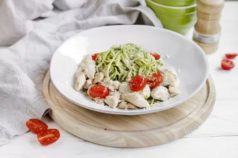 Шаг 4: Смешать готовые спагетти с курицей и соусом Песто. Посыпать тертым пармезаном и подавать горячими.