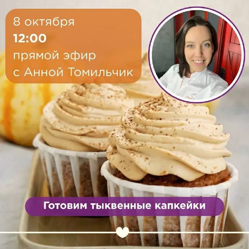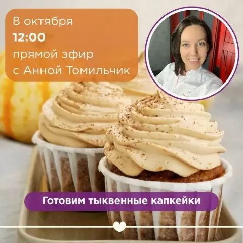 В прямом эфире в 12:00 по московскому времени Анна поделится рецептом ароматных тыквенных капкейков с грецким орехом и финиками, которые идеально подходят для Хеллоуина или могут стать чудесным подарком для близких. Участники узнают тонкости создания ганаша с сыром и получат подсказки по замесу теста нужной консистенции.