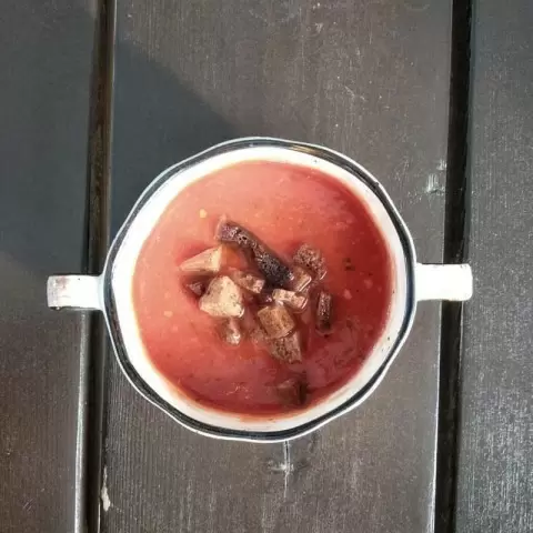 Как готовить? Сначала соедините томаты и томатный сок, добавьте сок лимона, рубленую кинзу и чеснок, затем всё измельчите блендером. Следом подрегулируйте вкус с солью. Подавайте с крошеным ржаным хлебом или гренками.