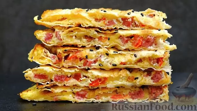 - Для быстрого перекуса попробуйте лаваш с сыром, колбасой, помидорами и яйцами – готовится за 15 минут, а в разрезе выглядит просто восхитительно.