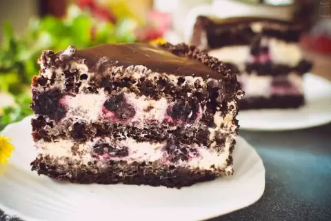 Торт черный бархат — это не просто десерт, это воплощение шоколадного блаженства! Сочетание бисквитных шоколадных коржей, щедро пропитанных сливочно-творожным кремом, и нежного черничного конфи делает его поистине уникальным. Нежные и пористые шоколадные тортики остаются фаворитом для многих гурманов и сладкоежек.