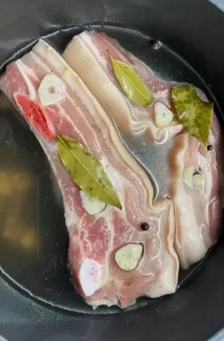 После закипания, положить в кастрюлю кусок сала, шкуркой вниз, так, чтобы вода покрывала лишь шкурку. Прокипятить в этом состоянии в течение 5-7 минут.
