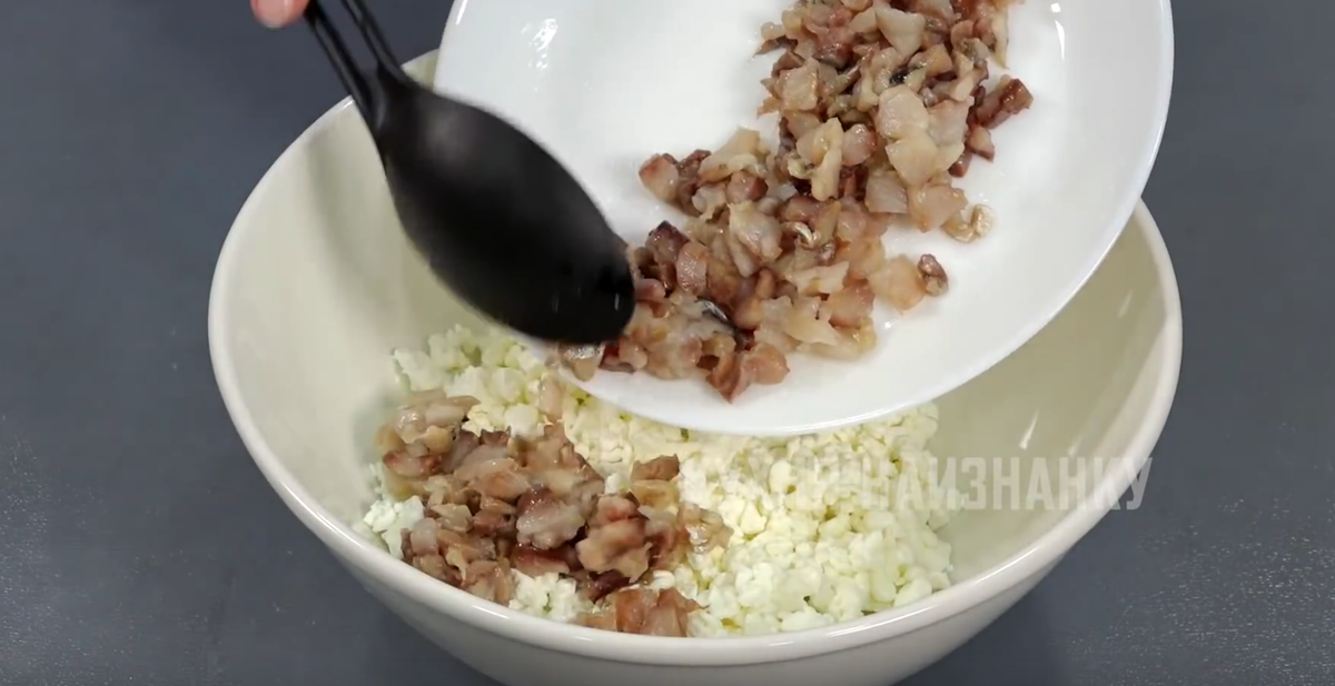 - Подготовка ингредиентов: 200 г творога и 100 г селедки, нарезанной мелко с удаленными костями.