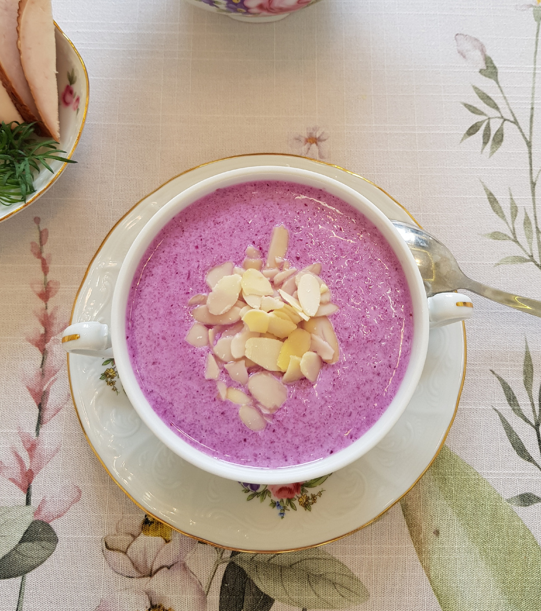 Готовый гаспачо следует разлить по красивым бульонницам и украсить миндальными лепестками. Это блюдо великолепно сочетается с гарниром из копченой утиной грудки и свежего укропа. Приятного аппетита!