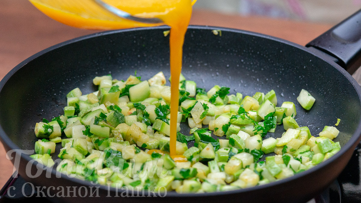 Шаг 5: Аккуратно вылейте взбитые яйца на овощи и готовьте до полной готовности, постоянно помешивая лопаткой.